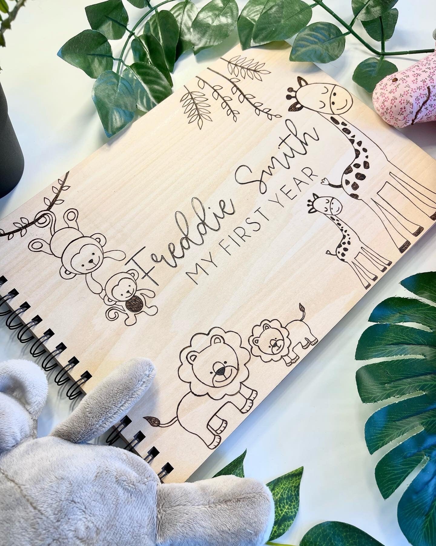 Personalised A4 wooden engraved Baby animal scrapbook/ my first year/ baby book/ baby journal/ memory gift/new baby gift- Laser/ Hand burnt