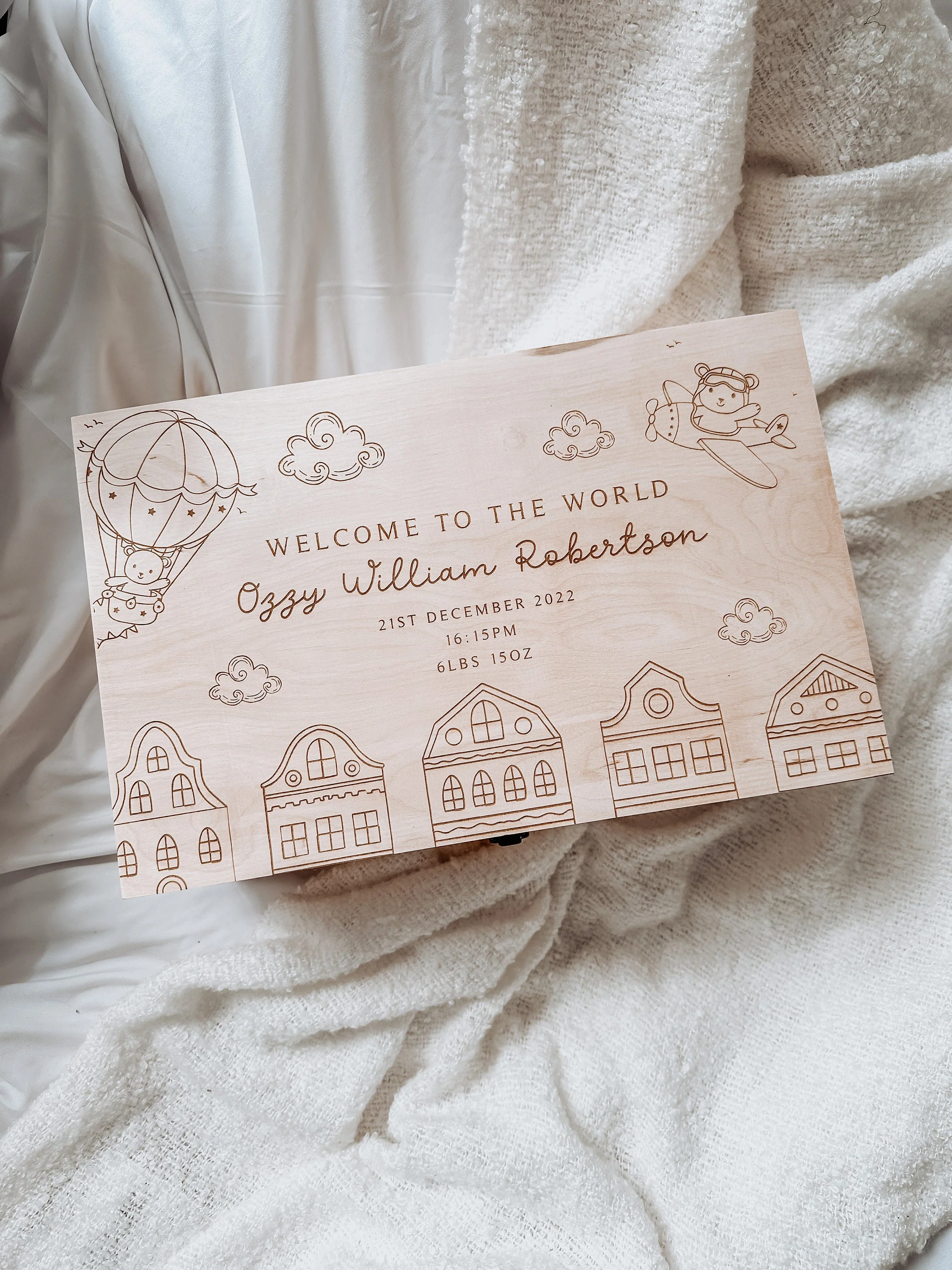 A unique personalized wooden nursery memory box to store all your little ones firsts. These gorgeous memory boxes are the perfect place to stores their first blanket, teddy, booties, tooth, scan pictures, first outfit and hospital bands.